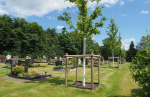 Immer wieder wurde in der Vergangenheit der Pflegezustand unseres Friedhofs bemängelt. Im Rahmen der Neugestaltung waren die abgelaufenen und ausgeworfenen Gräber wegen ihrer brachliegenden Flächen in der Tat alles andere als ein schöner Anblick. Inzwischen wurden diese Flächen mit Rasen eingesät und zudem eine Reihe von Bäumen aufgestellt.