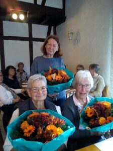Nach der Stärkung mit Kaffee fund Kuchen folgte der Tätigkeitsbericht und eine Info über die kfd-Mitgliederentwicklung, von der noch amtierenden Schriftführerin, Elisabeth Mohrs. Leider hat sich Frau Mohrs nicht mehr bereit erklärt für das Amt, für weitere 2 Jahre zu kandidieren. Aus dem Vorstand sind ebenfalls Gaby Remmers und Mechthild Reufsteck ausgeschieden. Vorsitzende Inge Becker bedankte sich bei Ihnen für Ihre Mitarbeit mit einem wunderschönen bunten Herbststrauß.