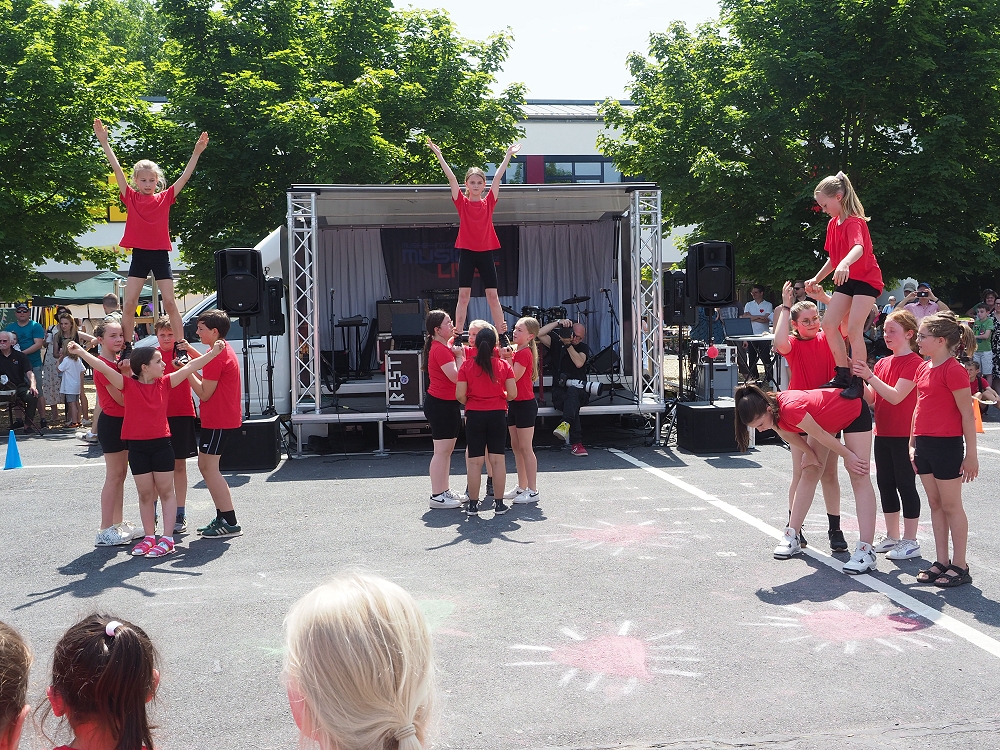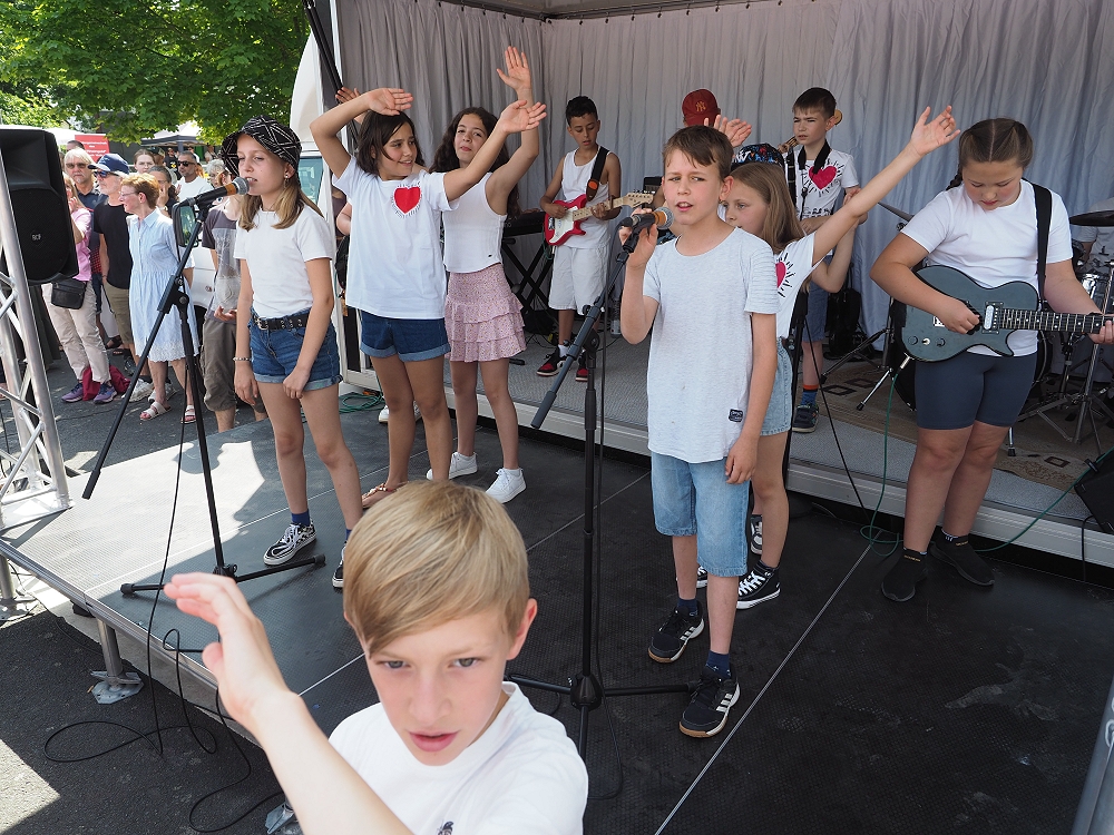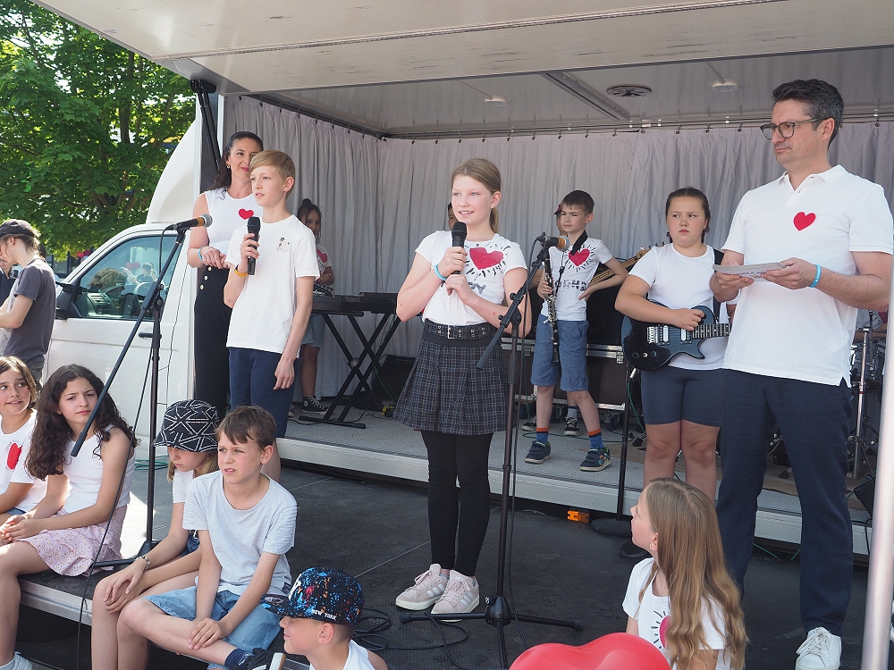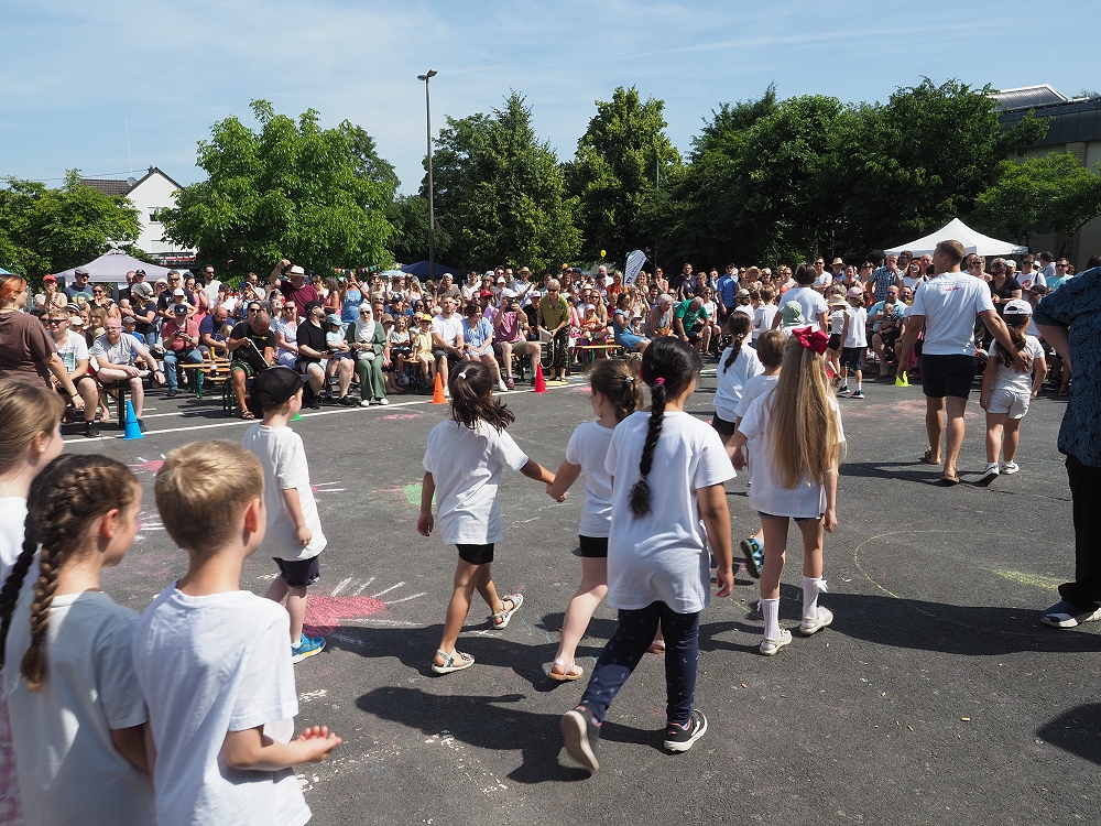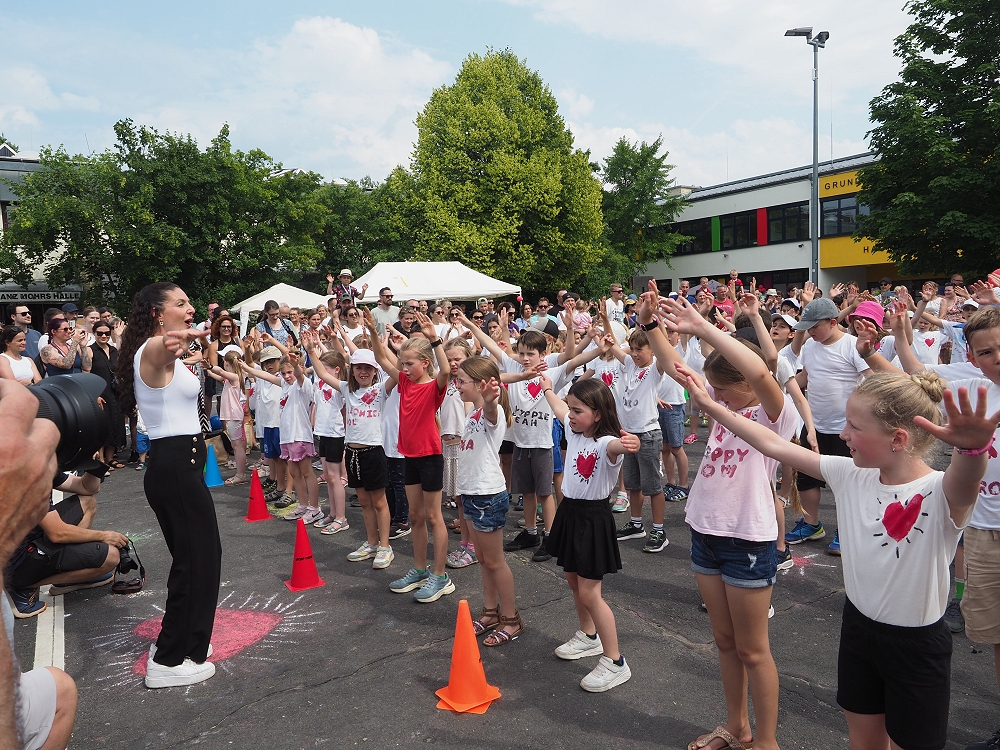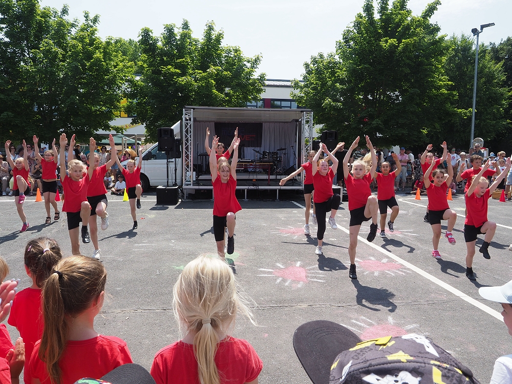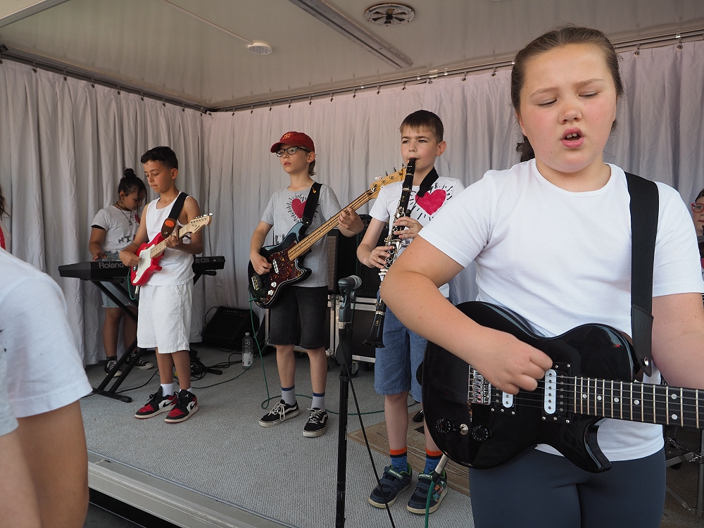 Eröffnet wurde das Schulfest mit der mit Spannung erwarteten Uraufführung des neu kreierten Schulsongs „Grundschule mit Herz“. Es war in der Tat für alle Beteiligten, wie auch die Besucher, ein ganz besonderer Moment. Über mehrere Wochen haben Schülerinnen und Schüler mit Unterstützung von Musik Live und der Band Band Pencilbreakers das Lied nicht nur textlich, sondern auch instrumental einstudiert. Viel Beifall war letztlich der verdiente Lohn für diese mehr als freudige und begeisternde Aufführung! (Anhören)