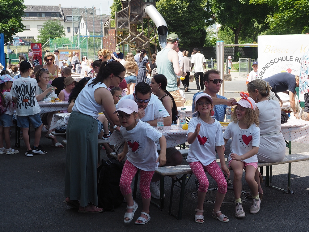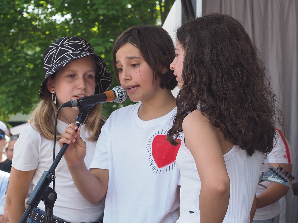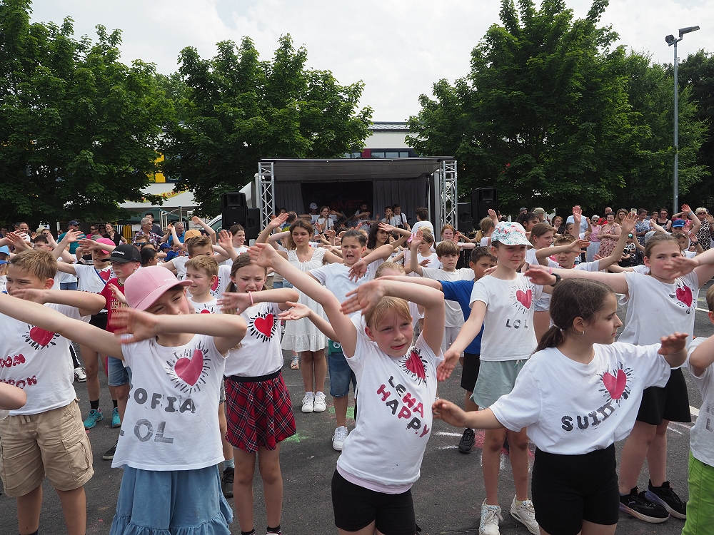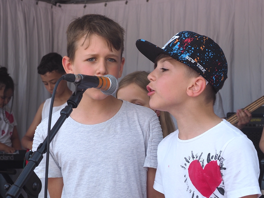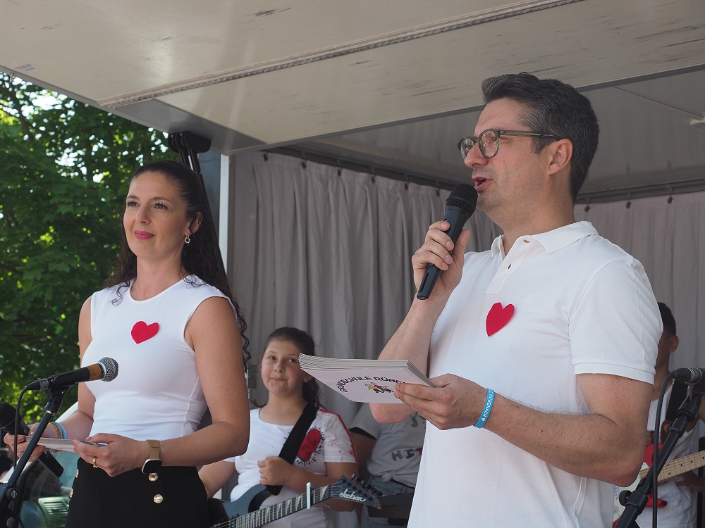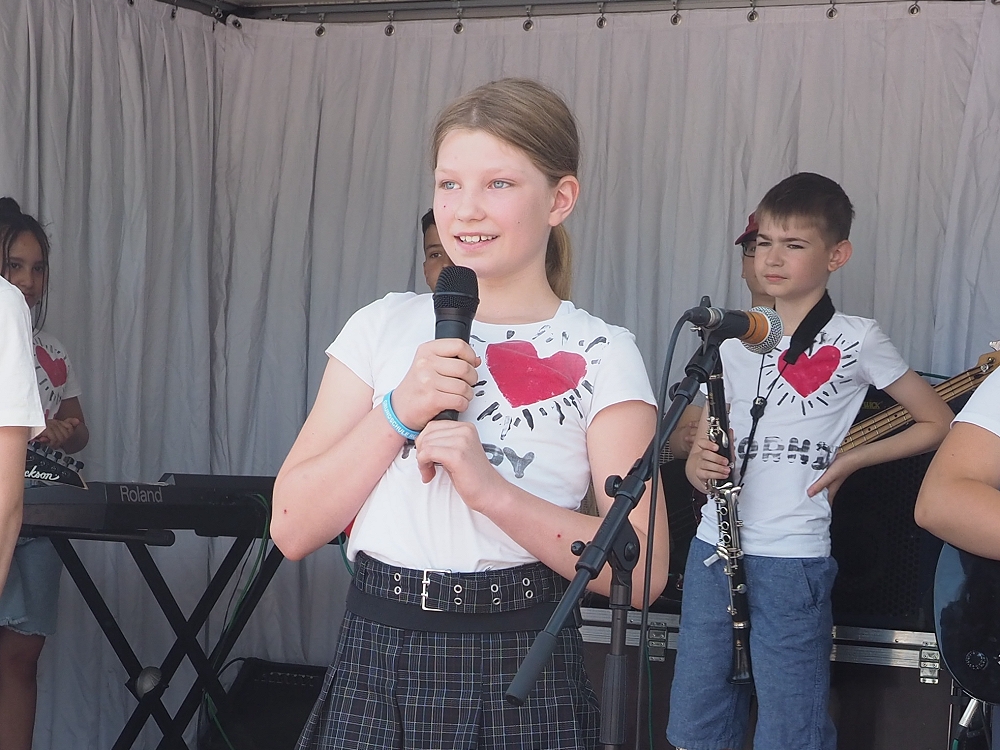 Eröffnet wurde das Schulfest mit der mit Spannung erwarteten Uraufführung des neu kreierten Schulsongs „Grundschule mit Herz“. Es war in der Tat für alle Beteiligten, wie auch die Besucher, ein ganz besonderer Moment. Über mehrere Wochen haben Schülerinnen und Schüler mit Unterstützung von Musik Live und der Band Band Pencilbreakers das Lied nicht nur textlich, sondern auch instrumental einstudiert. Viel Beifall war letztlich der verdiente Lohn für diese mehr als freudige und begeisternde Aufführung! (Anhören)