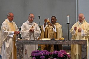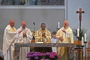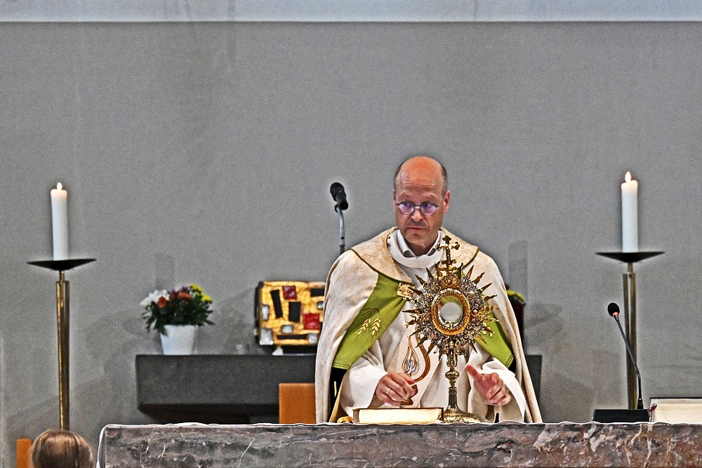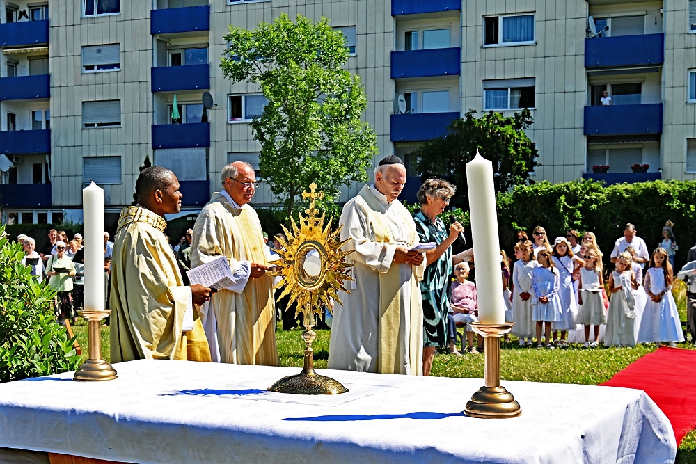 Die Messe wurde von einem Projektchor unter Leitung von Thomas Oster begleitet. Nach der feierlichen Messe, gehalten von Pater Chigozie Odibo, wurde die Monstranz mit der geweihten Hostie unter dem Baldachin von den Rübenacher Schützen durch die Pollenfeldsiedlung bis zu einem Altar am Himmeroder Platz getragen.