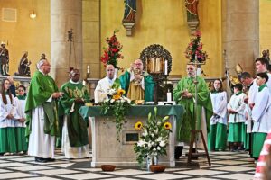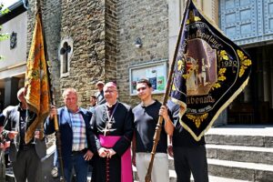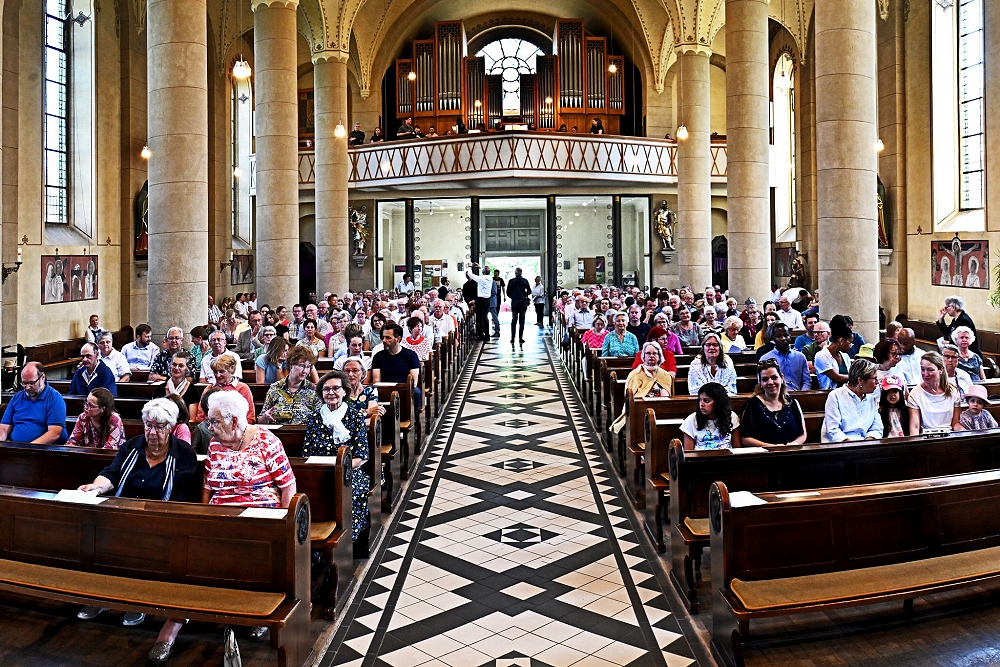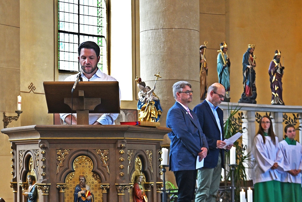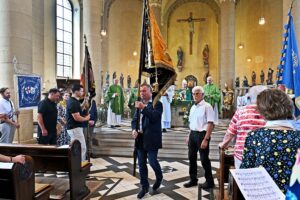 Nach dem feierlichen Einzug, begleitet durch etliche Fahnenabordnungen der Ortsvereine, bedankte sich Pater Chigozie Odibo bei seiner Begrüßung dann auch für das Erscheinen des Kirchenchefs hier vor Ort. Worauf dieser noch einmal bekundete, das es für ihn selbstverständlich eine Ehre sei, die Messe zu den Jubiläumsanlässen zu lesen.