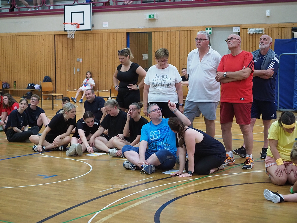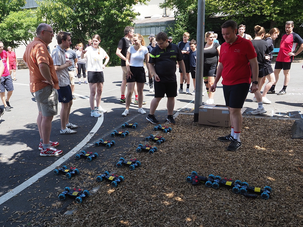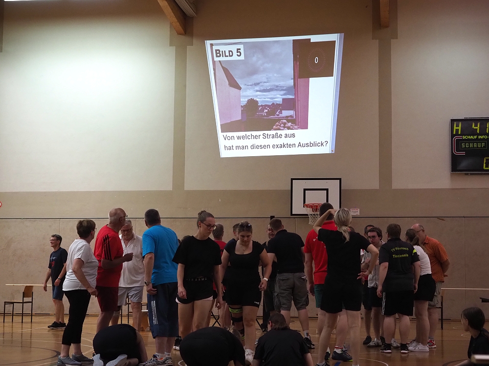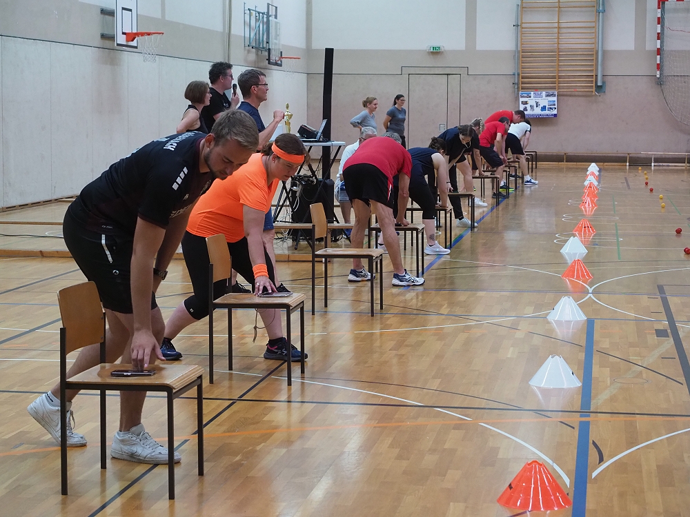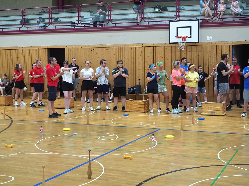 Anlässlich des 125-jährigen Vereinsjubiläums des TV Rübenach wurde am Samstag, 28. Juni zum „Spiel ohne Grenzen“ eingeladen. 11 Teams, bestehend aus fünf oder mehr Personen, kämpften in der Franz-Mohrs-Halle bestens gelaunt, mit viel Spaß und einer dazu gehörenden Portion Ehrgeiz um den nebenstehenden Siegerpokal. Und dazu hatten sich die Organisatoren um Vorstandssprecher und Moderator der Veranstaltung Marc Geisen einiges einfallen lassen!