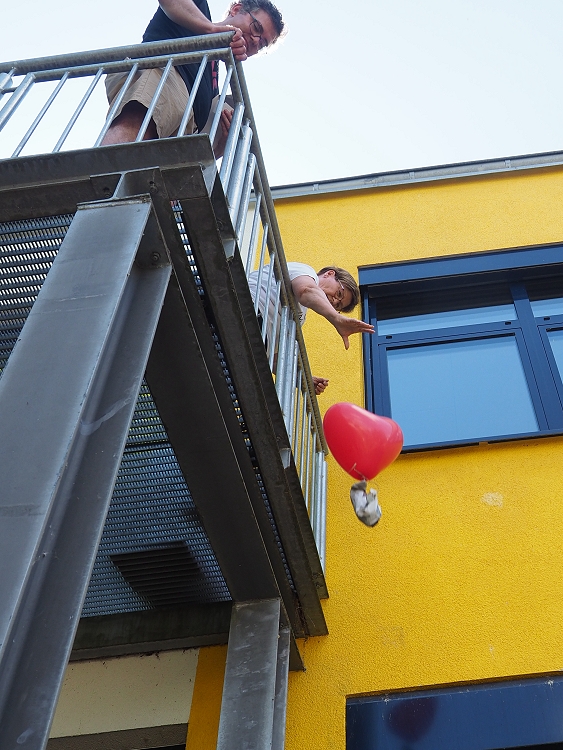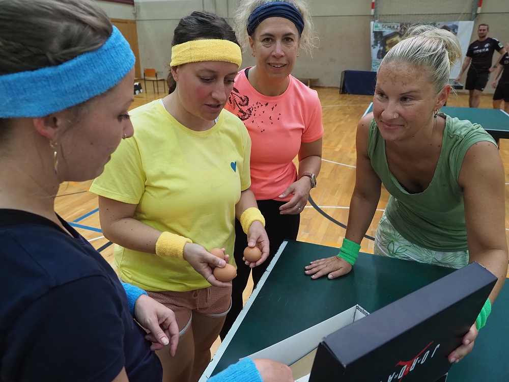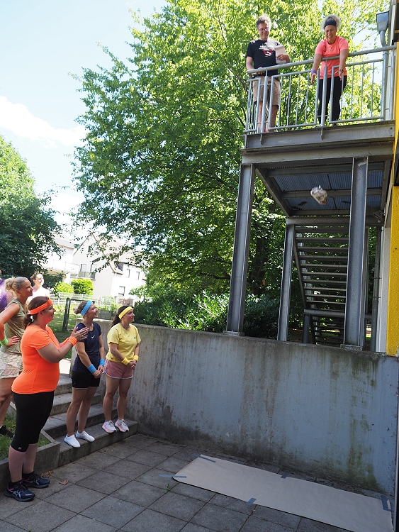 Einer der Höhepunkte war zweifellos das originelle Spiel mit rohen Eiern. Hier mussten drei Hühnereier mit vorgegebenem Verpackungsmaterial (Luftballons, Zeitungspapier, Klebeband, …) so sicher verpackt werden, dass sie einen Abwurf aus 5 Metern Höhe unbeschadet überstehen! Eine Herausforderung, die es zweifellos in sich hatte. Hier zeigte das Team der Rübenacher CDU, das in der Tat auch Politiker einer solchen Herausforderung durchaus gewachsen sind. Alle drei CDU-Eier blieben heil!
