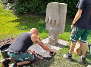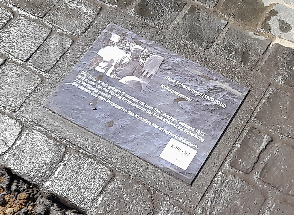 Die im November 2024 aufgestellte Skulptur am Rudi-Scheuermann-Weg erhielt zusätzlich jetzt noch eine Hinweistafel. Nach dem hier im Ort gelebt und gewirkt habenden Künstler wurde im Januar zuvor als Erinnerung der Weg durch das Naherholungsgebiet Am Mühlenteich nach ihm benannt. Mitarbeiter der Stadt Koblenz haben am Donnerstag, 17. Juli die Bodentafel installiert.