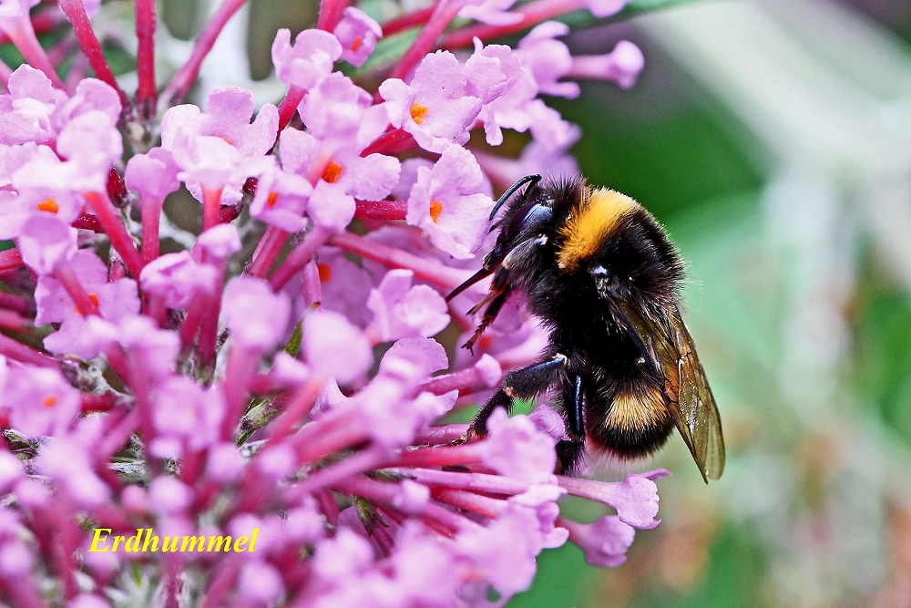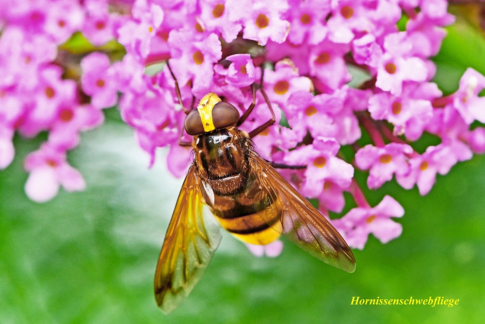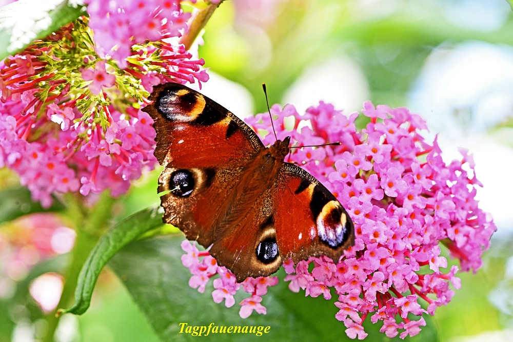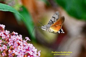 Er blüht derzeit in Parks und vielen Gärten, der Sommerflieder, auch Schmetterlingsflieder genannt. Die rispigen Blütenstände sind mit sehr vielen nektarreichen Blüten besetzt und verbreiten einen intensiven honigartigen Geruch. Dieser lockt viele Schmetterlinge aller Art und andere Insekten an. Hauptsächlich das Tagpfauenauge und das Taubenschwänzchen mit seinem ca. 25 Millimeter langem Saugrüssel werden von den nektarreichen Blüten magisch angezogen. Aber auch Schwebfliegen, Hummeln und Bienen sind häufig auf den Blütenkerzen zu sehen.