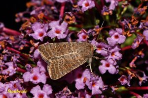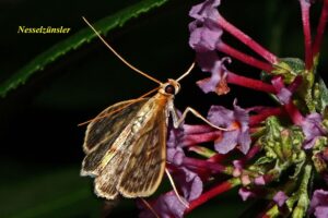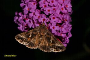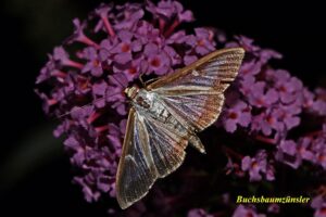In der Dämmerung ist dann Schichtwechsel angesagt und die Nachtfalter machen sich über die Blüten her. Die Beobachtung der nachtaktiven Tiere ist schon etwas schwieriger, da die Nachtfalter meist unscheinbar gefärbt und in der Regel lichtscheu sind. Die nachfolgenden Aufnahmen wurden an einem einzigen Schmetterlingsstrauch in einem Rübenacher Garten gemacht.