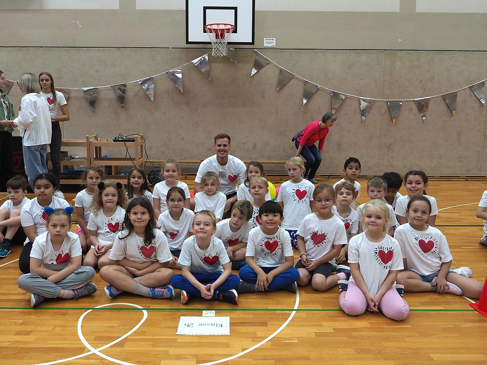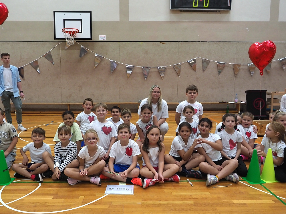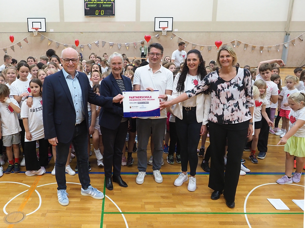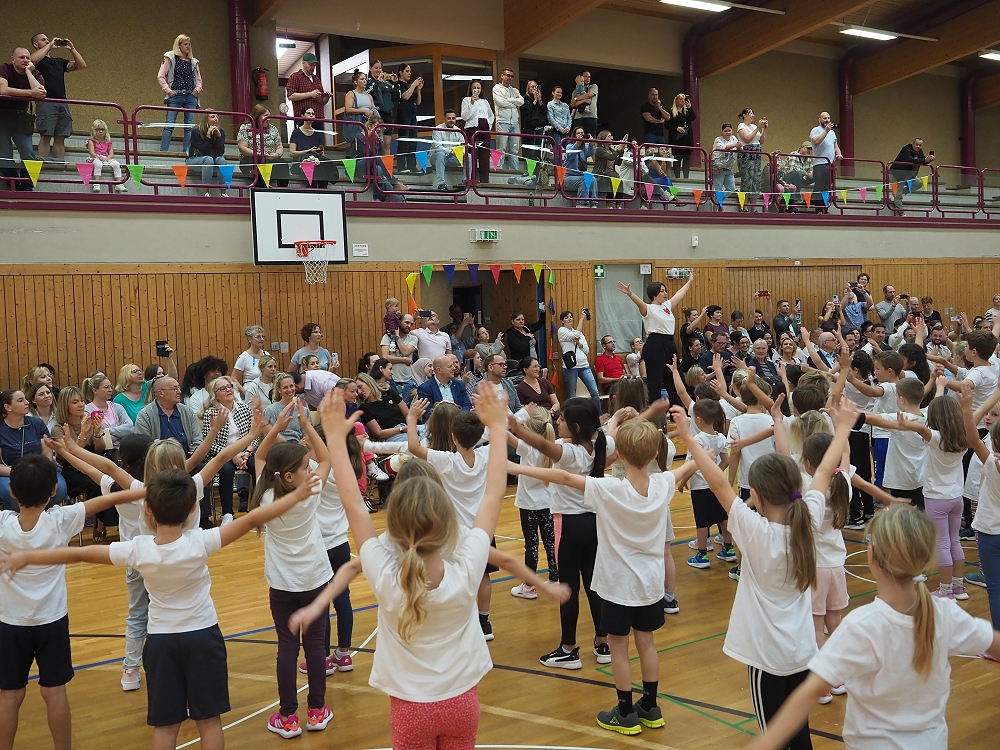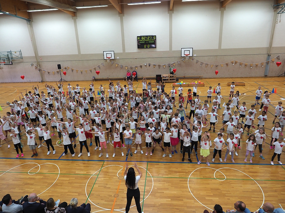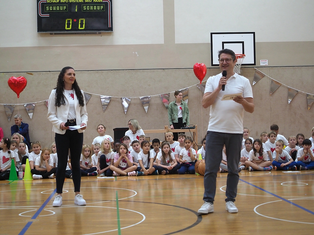 Die feierliche Verleihung fand in der Schulsporthalle statt, wo alle Schülerinnen und Schüler gemeinsam mit dem Schulteam, zahlreichen Eltern und den geladenen Ehrengästen die Auszeichnung begingen. Nachdem die Kinder mit ihrer Schulhymne „Grundschule mit Herz“ die Feierstunde eröffneten, begeisterten sie mit einem sportlichen Begleitprogramm die Gäste: von Cheerleading über Jonglage-Vorführungen bis zu Ringkämpfen und choreografierten Tänzen zeigten die Kinder ihre Leidenschaft für den Sport.