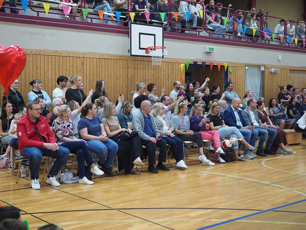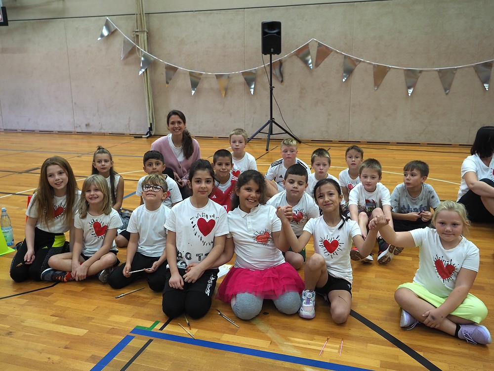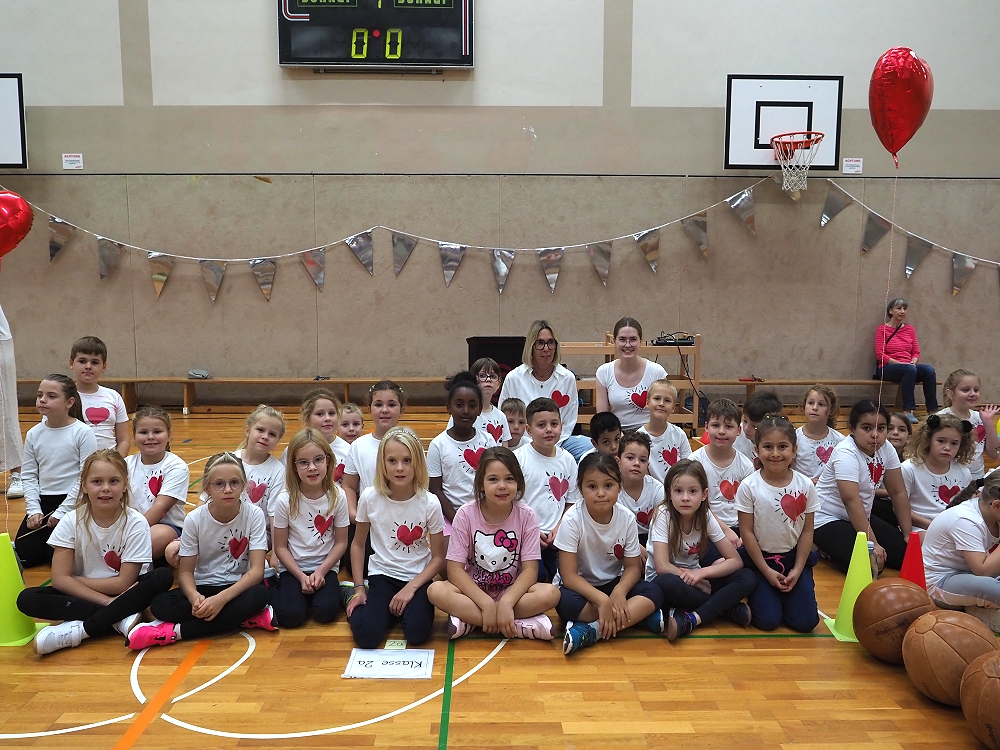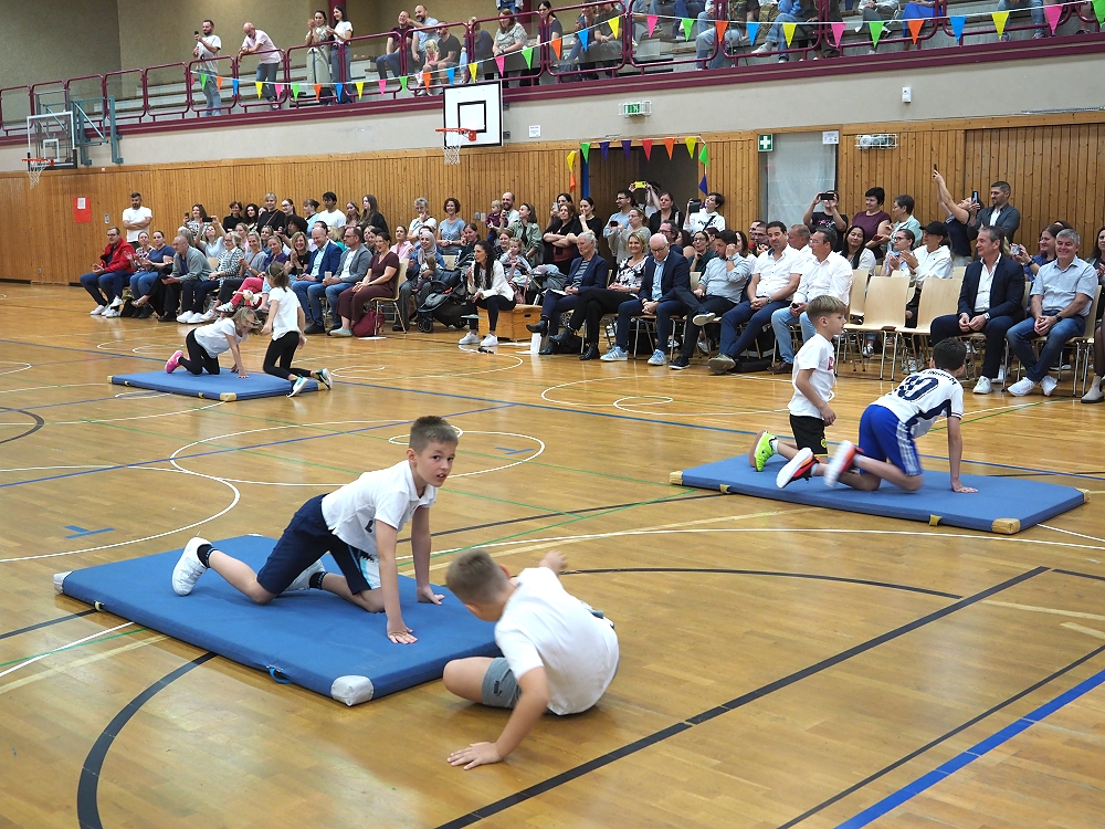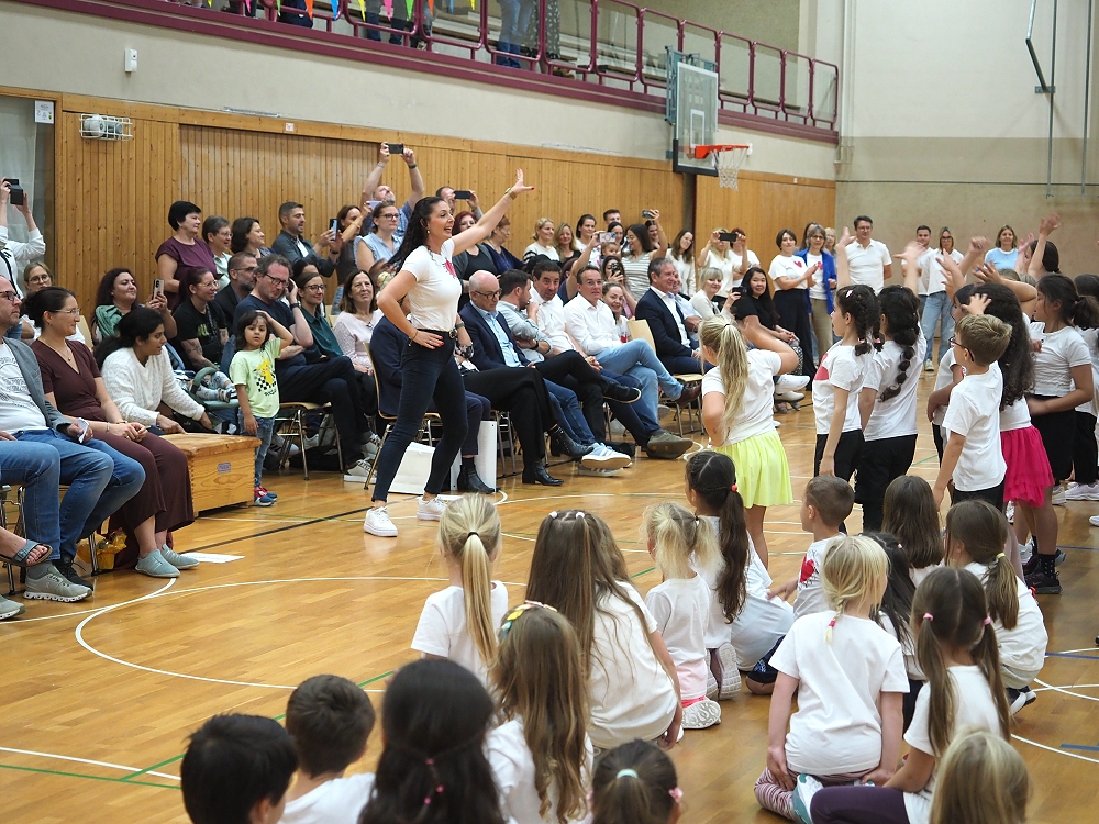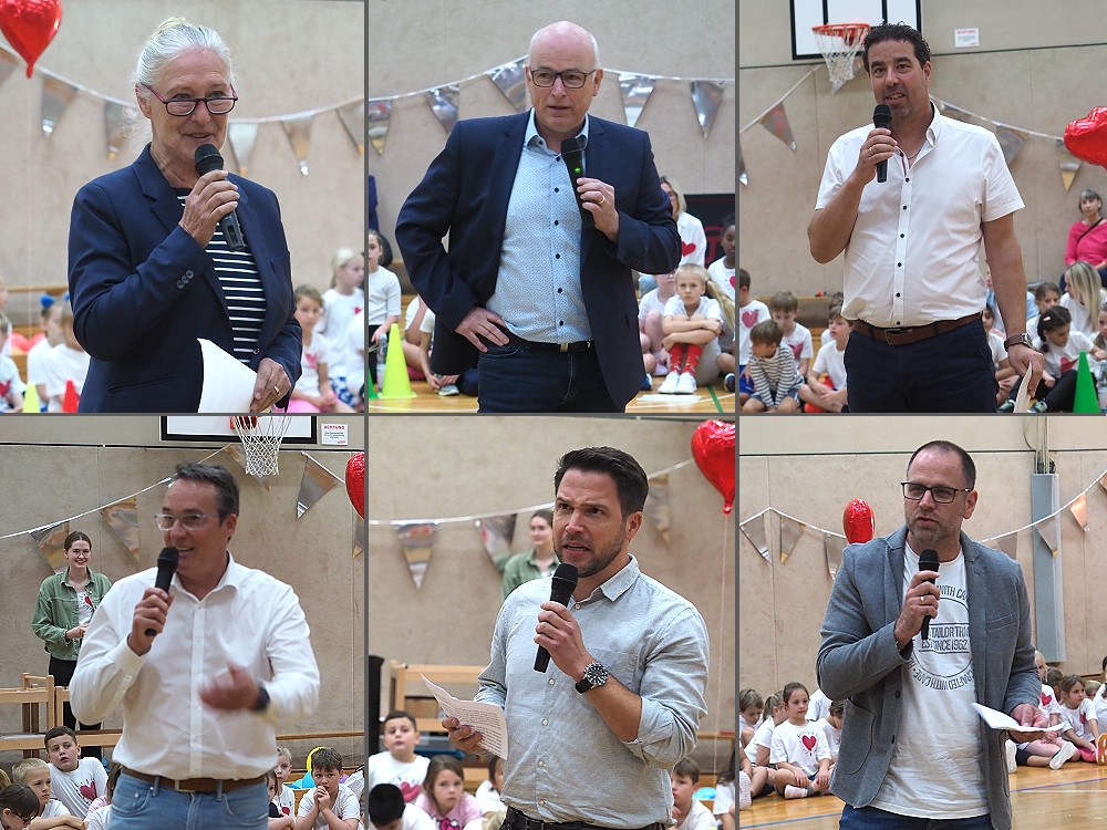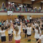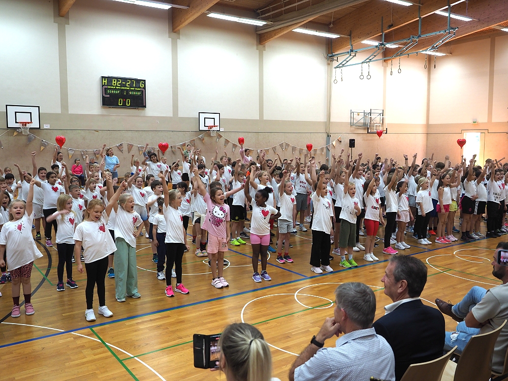 Die feierliche Verleihung fand in der Schulsporthalle statt, wo alle Schülerinnen und Schüler gemeinsam mit dem Schulteam, zahlreichen Eltern und den geladenen Ehrengästen die Auszeichnung begingen. Nachdem die Kinder mit ihrer Schulhymne „Grundschule mit Herz“ die Feierstunde eröffneten, begeisterten sie mit einem sportlichen Begleitprogramm die Gäste: von Cheerleading über Jonglage-Vorführungen bis zu Ringkämpfen und choreografierten Tänzen zeigten die Kinder ihre Leidenschaft für den Sport.