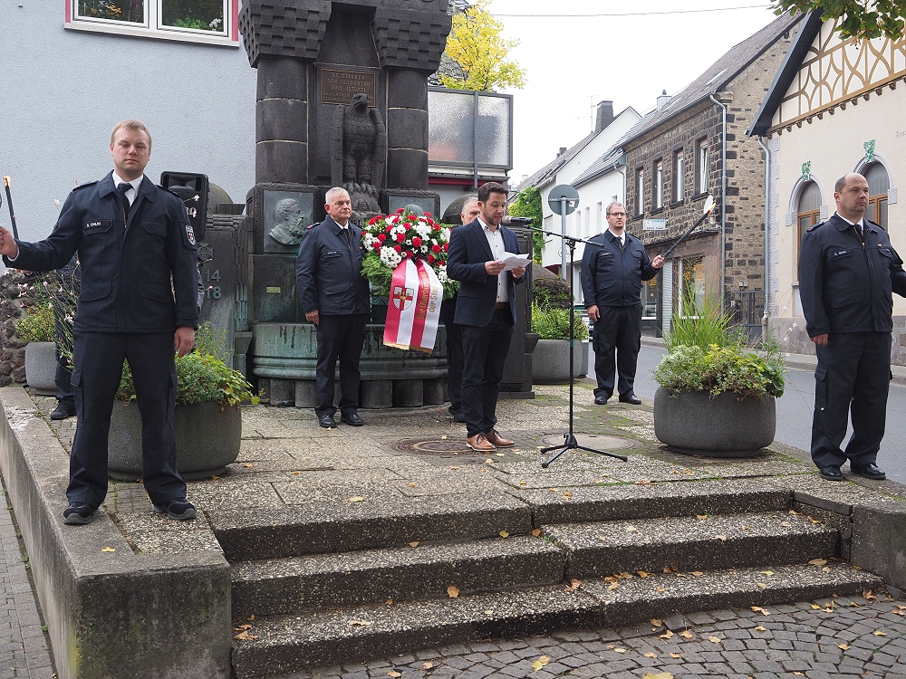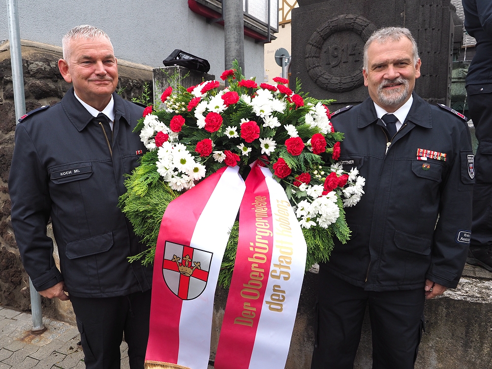 Im Anschluss an dem Kirchweihgottesdienst versammelten sich Bürger/innen und Vereinsabordnungen unter Mahnwache der Freiw. Feuerwehr Rübenach zur jährlichen Kranzniederlegung im Namen das Oberbürgermeisters der Stadt Koblenz.