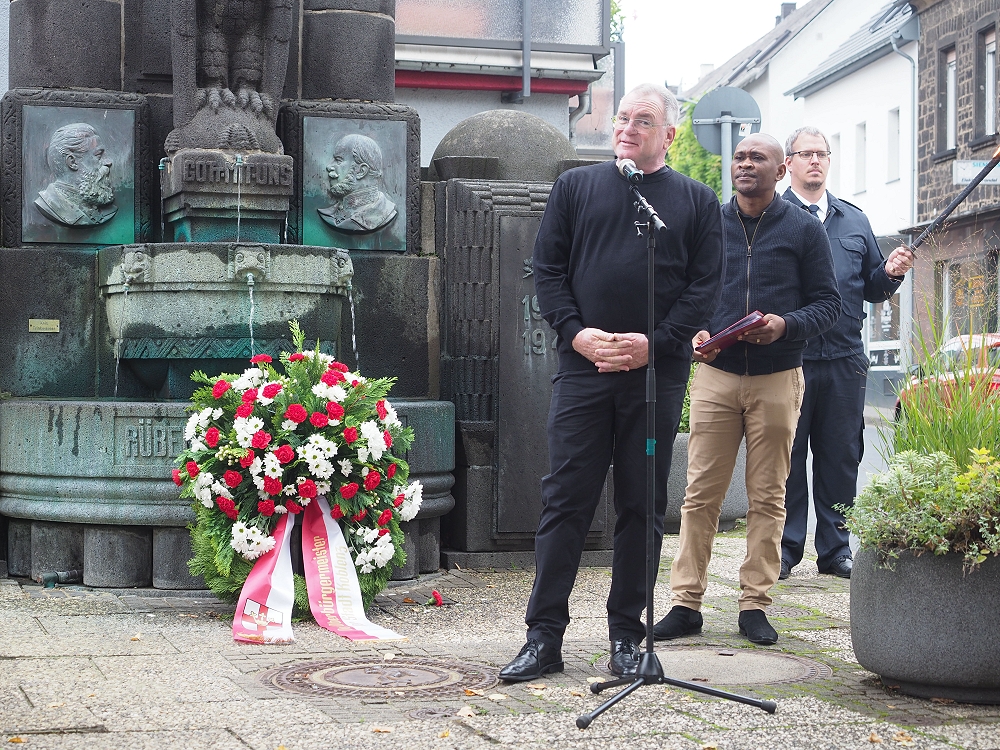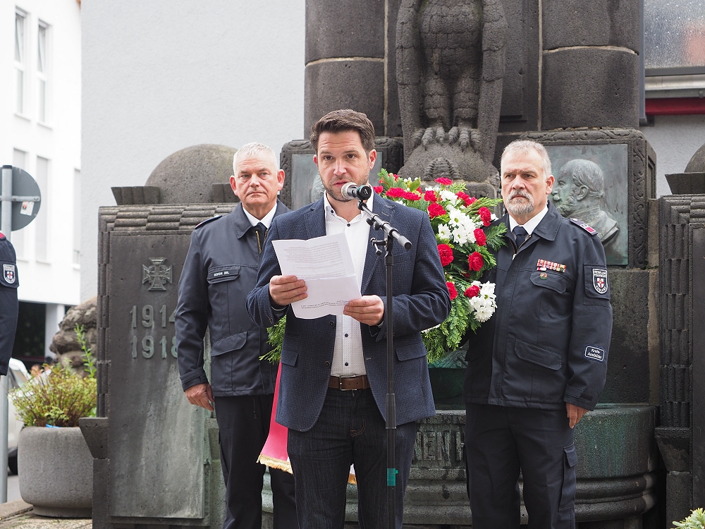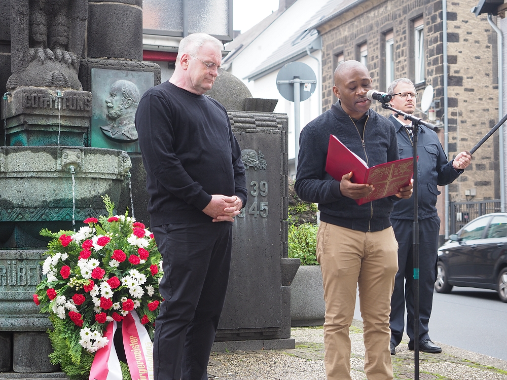 Nach einem Liedbeitrag des Männerchors 1854 Rübenach erinnerte Ortsvorsteher Thomas Roos in seiner Ansprache an die Geschehnisse und damit verbundenen Leiden der vergangenen Kriege mit der Hoffnung, das diese sich niemals wiederholen dürfen. Gleichzeitig wies er als positives Zeichen auf die gewachsene und praktizierende Zusammenarbeit hier im Ort, mit Blick auf die Rübenacher Kirmes wie auch das 1250-jährigen Ortsjubiläums unseres Stadtteils.