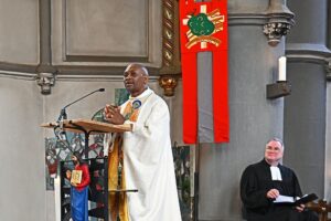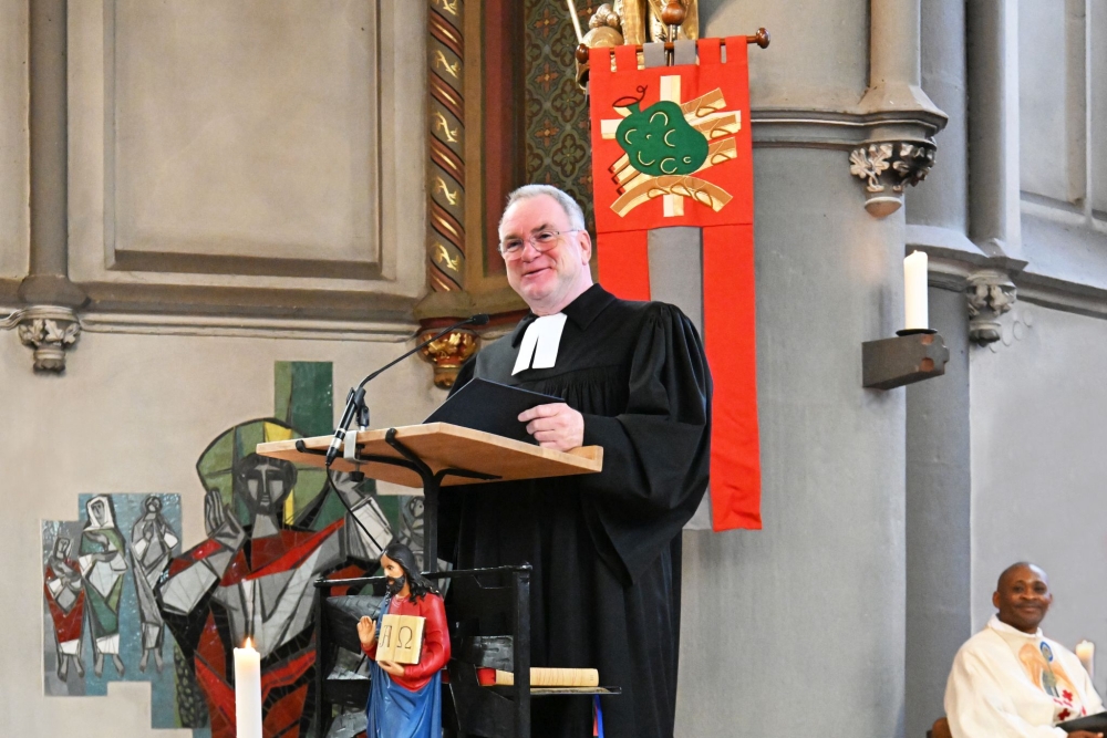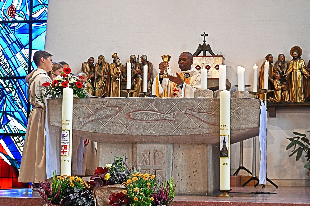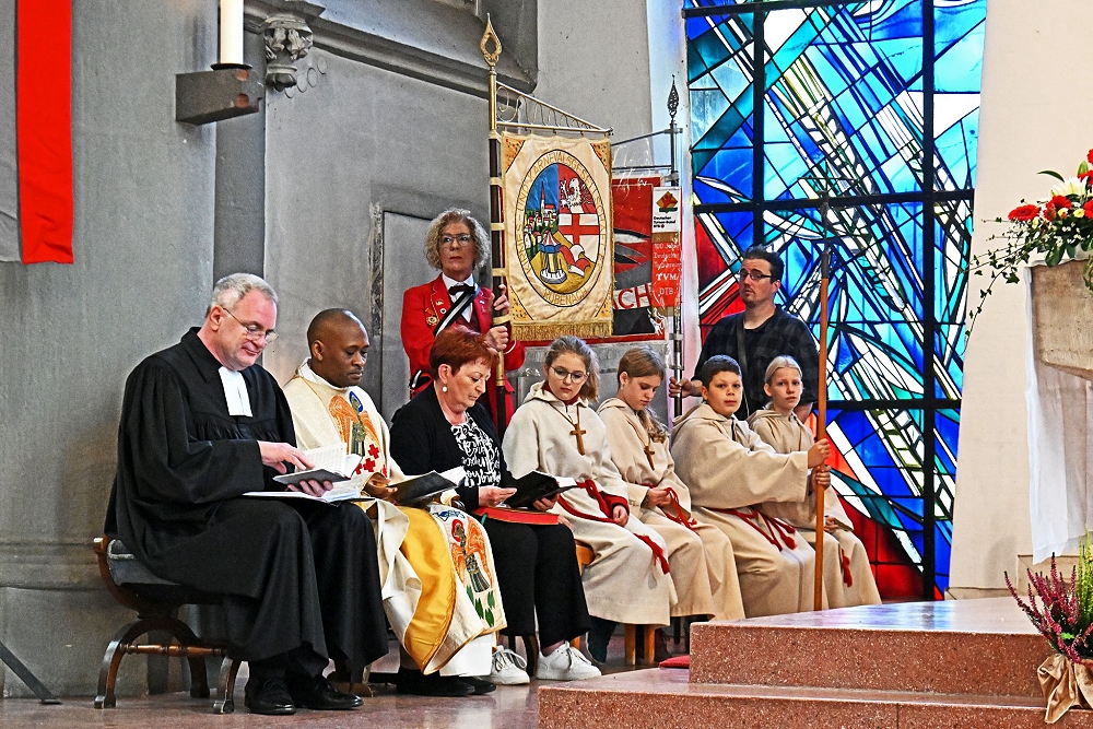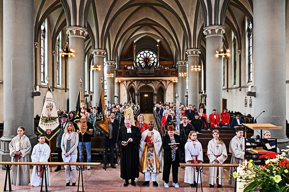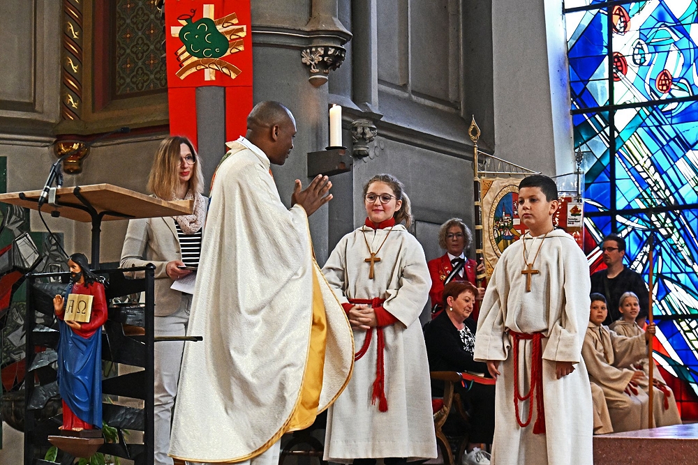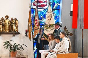 Der ökumenische Gottesdienst an Kirmessonntag, gehalten von Pater Donatus Chigozie Odibo von der Pfarrei St. Mauritius sowie Prädikant Harald Kruse von der Kirchengemeinde Urmitz-Mülheim, wurde u. a. feierlich mitgestaltet durch den Kirchenchor Cäcilia sowie Fahnenabordnungen Rübenacher Ortsvereine. Zu Beginn des Gottesdienstes erhielten aus der Hand von Pater Chigozie zwei Nachwuchsmessdiener/in als offizielle Einführung ihr persönliches Gewandkreuz.