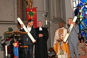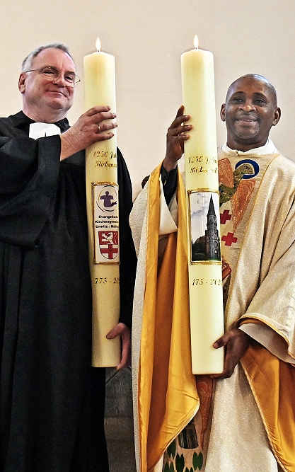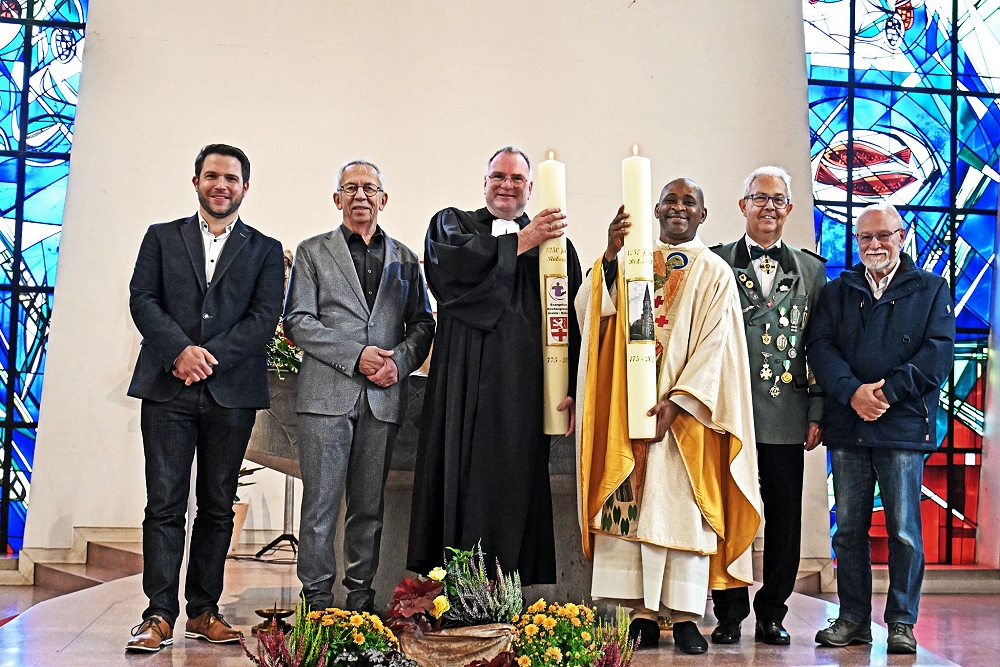 In Verlauf der Messe überreichten Thomas Roos und Herbert Hennes vom Verein „1250 Jahre Rübenach“ den Kirchenvertretern zur Erinnerung an das Ortsjubiläum je eine Jubiläumskerze. Dekoriert jeweils mit den Schriftzügen 1250 Jahre Rübenach und 775 – 2025 und dem Bild des Kirchturms von St. Mauritius auf der katholischen, sowie mit dem Logo der Kirchengemeinde Urmitz-Mülheim und dem Rübenacher Ortswappen auf der evangelischen Kerze.
