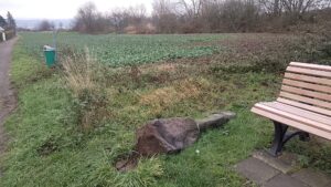 Die von dem Rübenacher Wolfgang Springer 2013 erschaffene und am Wirtschaftsweg 2020 um einen Sockel erweitert aufgestellte Jakobsstele, wurde jetzt aus ihrer Verankerung gerissen und umgestoßen vorgefunden. Geschehen ist dies bereits in der Nacht von Samstag, 29. auf Sonntag, 30. November.