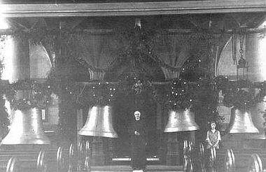 die Montage der Glocken im hohen Turm. Abends war das Werk vollendet