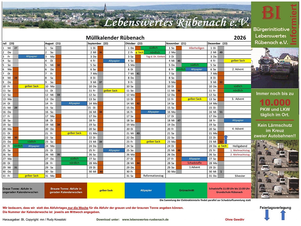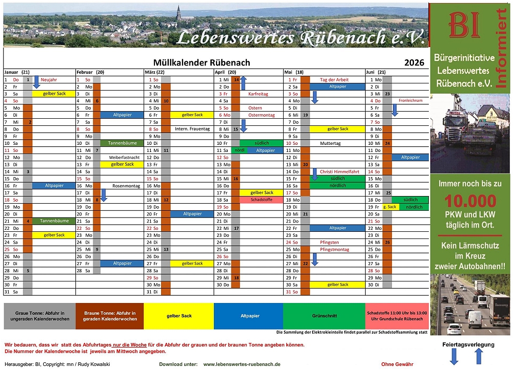 Der Rübenacher Müllkalender wird Herausgegeben von der Bürgerinitiative „Lebenswertes Rübenach“. Zum herunter laden einfach anklicken und ausdrucken.