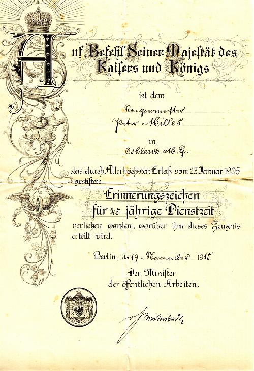 Urkunde zum Anlass des 25jährigen Dienstjubiläum von Peter Milles, Rangiermeister bei der Deutschen Bahn aus dem Jahre 1915. Zur Verfügung gestellt von Margret Haimann Rübenach.